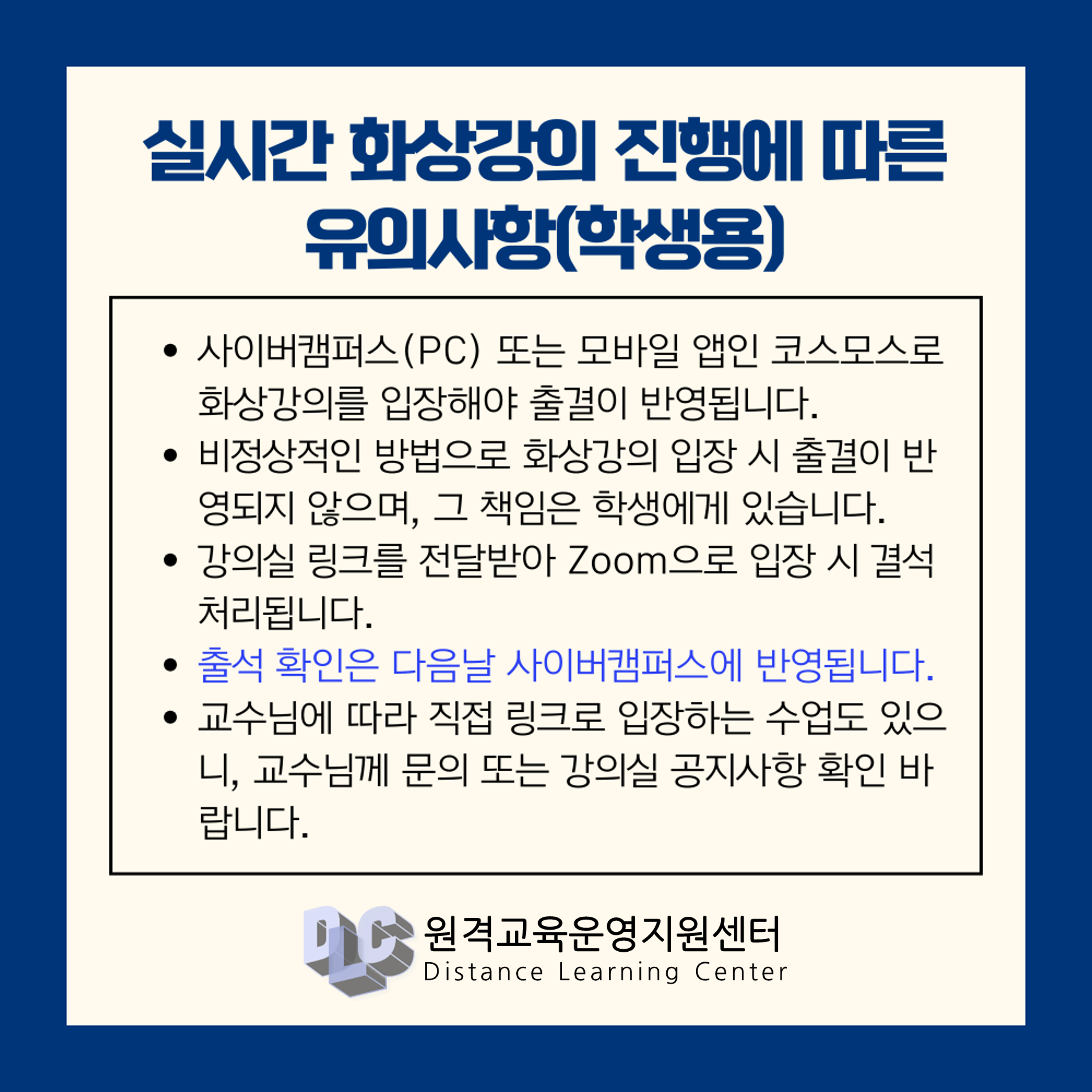 안녕하세요, 사이버캠퍼스 이용과 관련한 공지사항에 대해 안내드립니다.